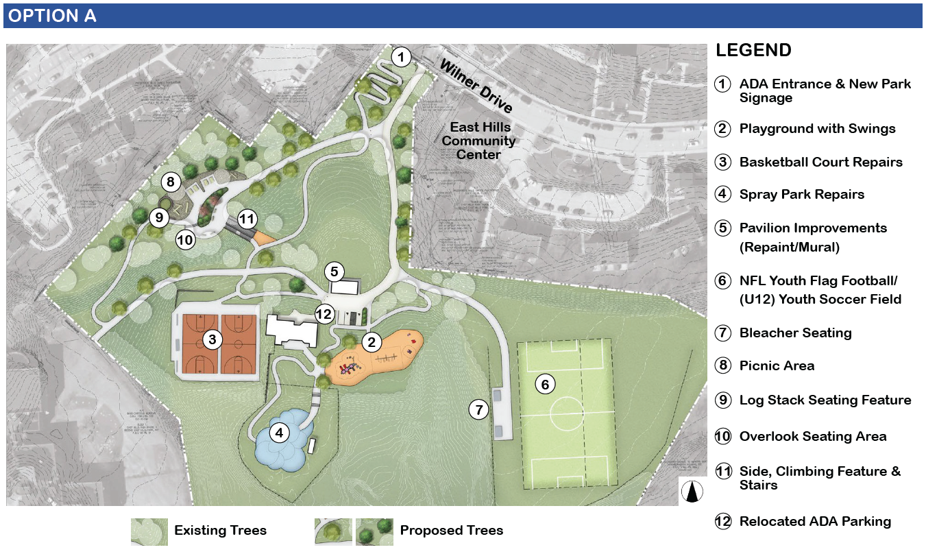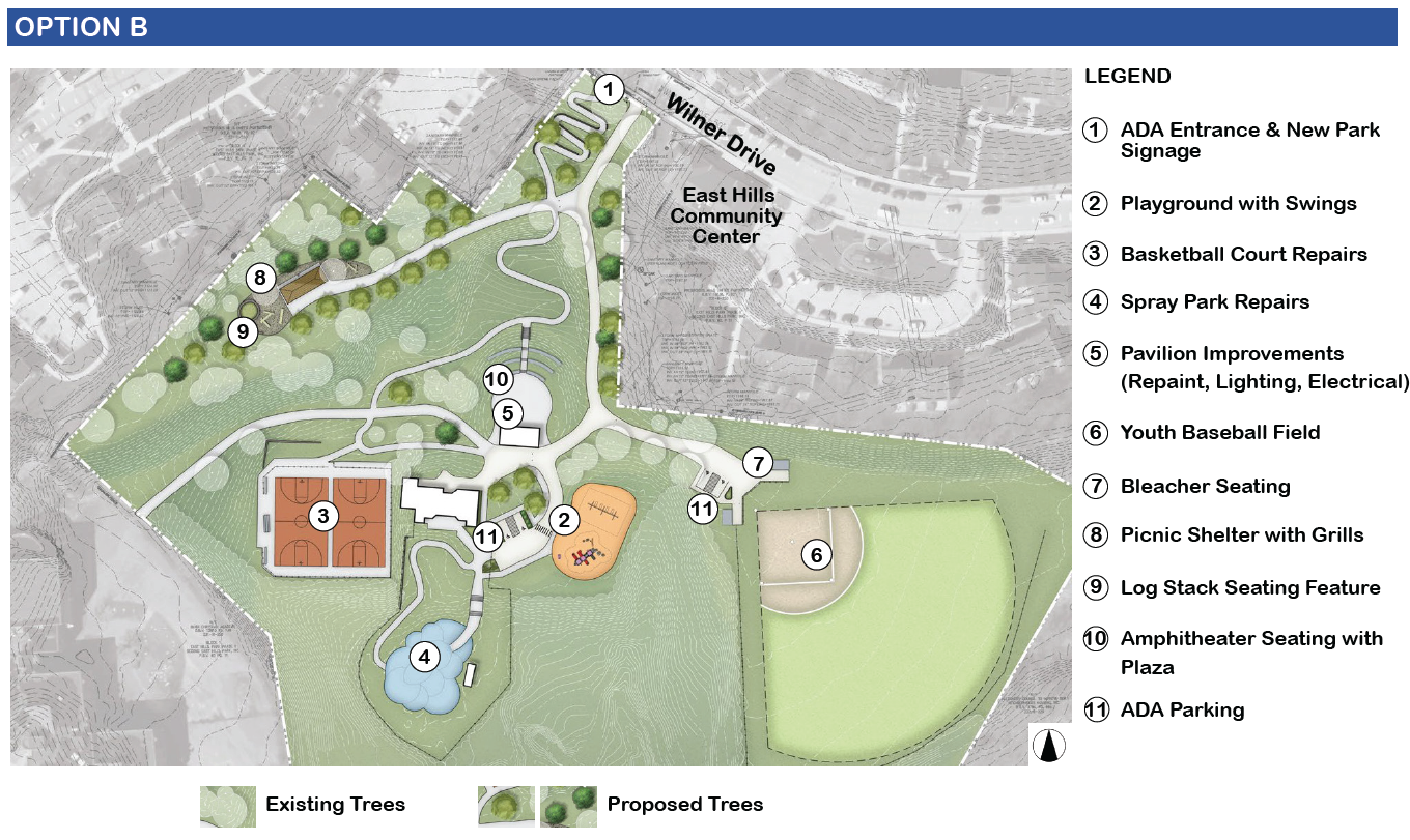The Department of Public Works (DPW) is working with a consultant team led by Ethos Collaborative and the East Hills community to develop plans for improvements at East Hills Park. Park upgrades will include: a new playground, picnic area, improvements and repairs to the basketball courts, park pavilion, spray park, and athletic field, as well as better site circulation, accessibility, lighting, and stormwater management.