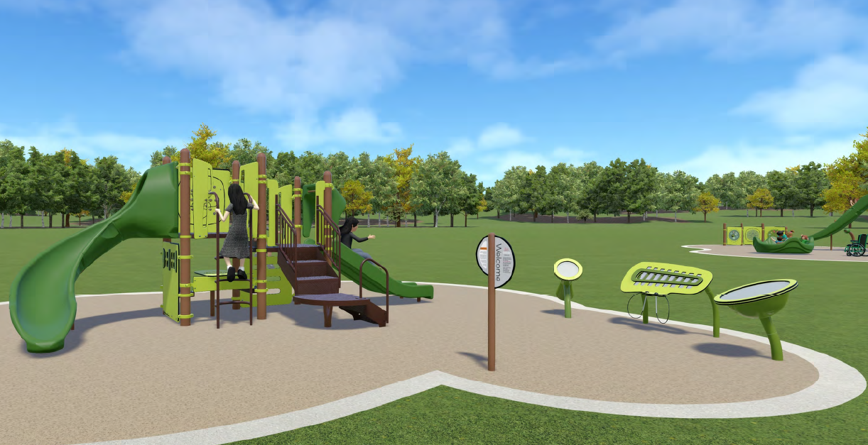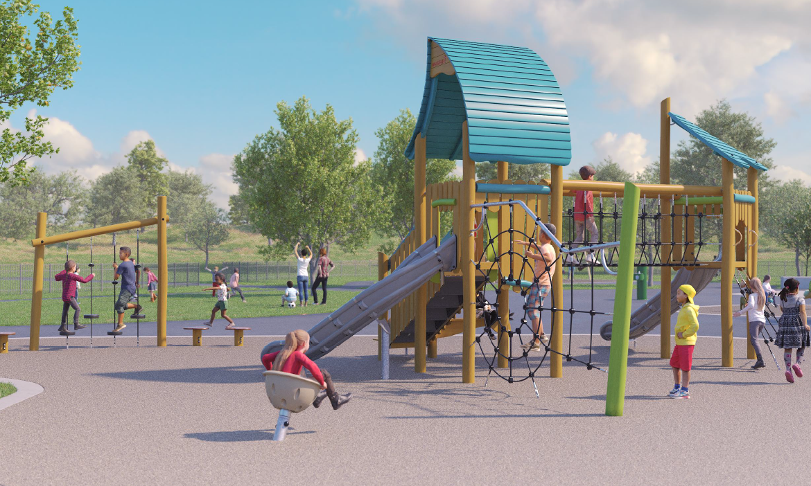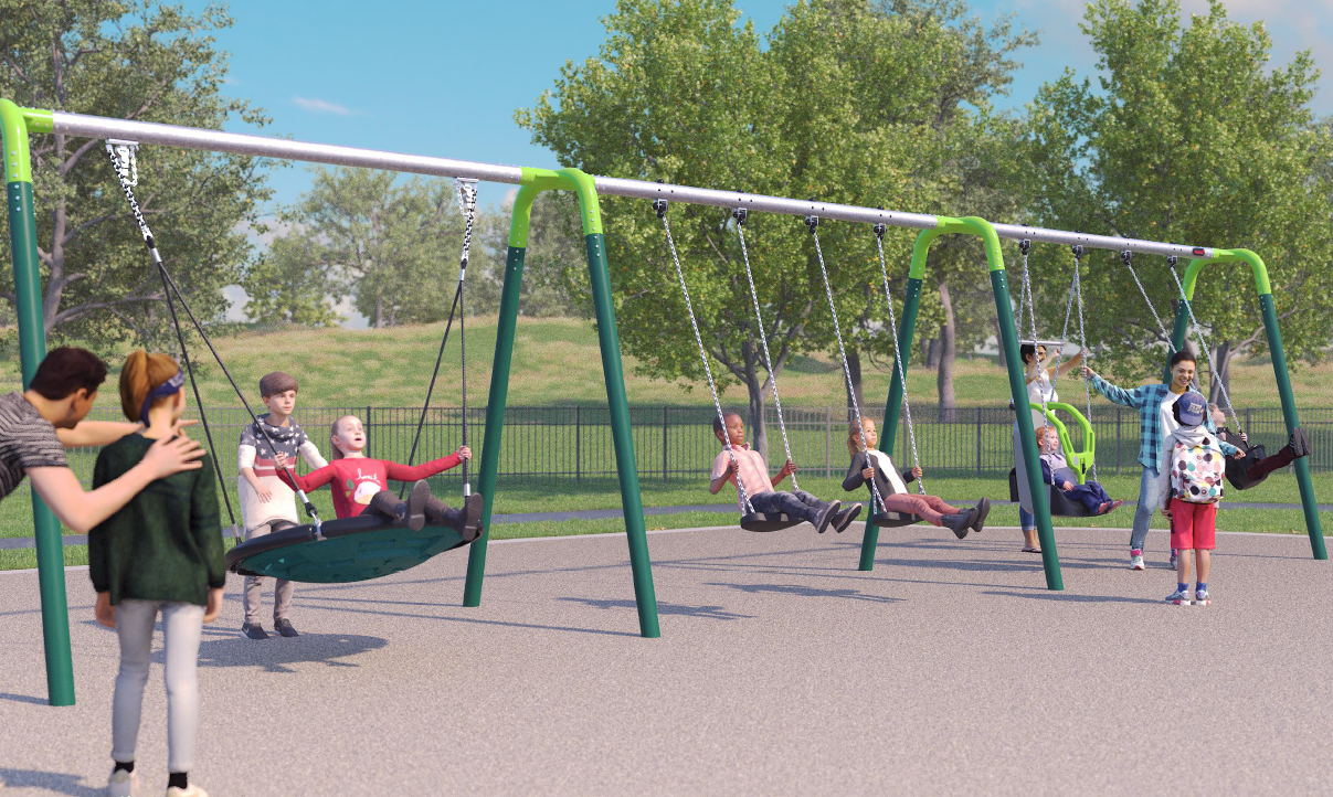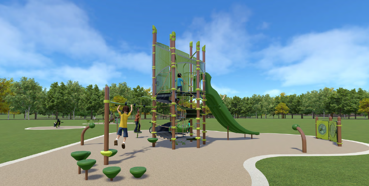 Please note: The renderings only show one view, however, all of the designs have an emphasis on inclusive and accessible play and include various types of ground features, climbing options, spinning, sensory stimulation, swings and an upgraded spray feature.