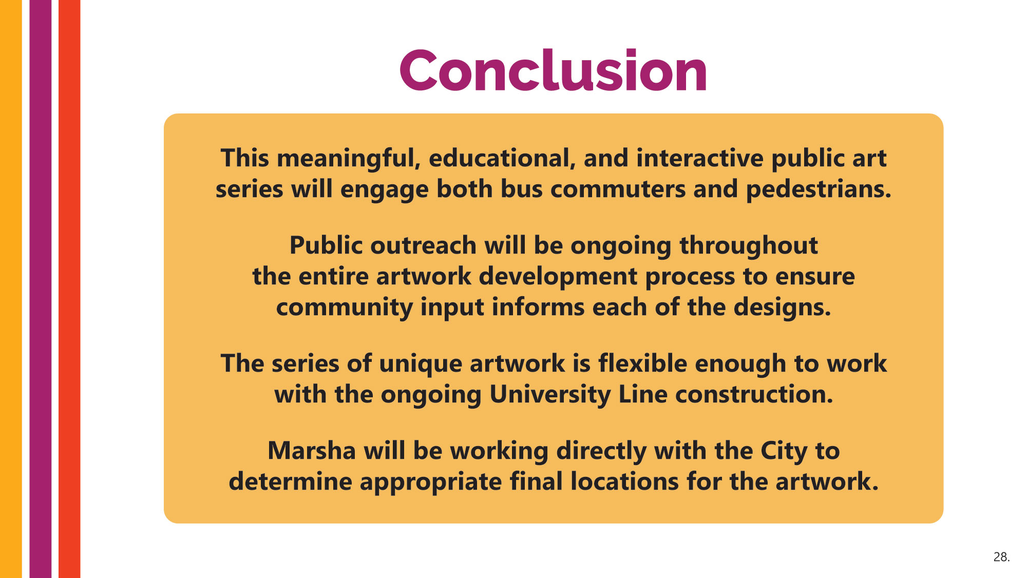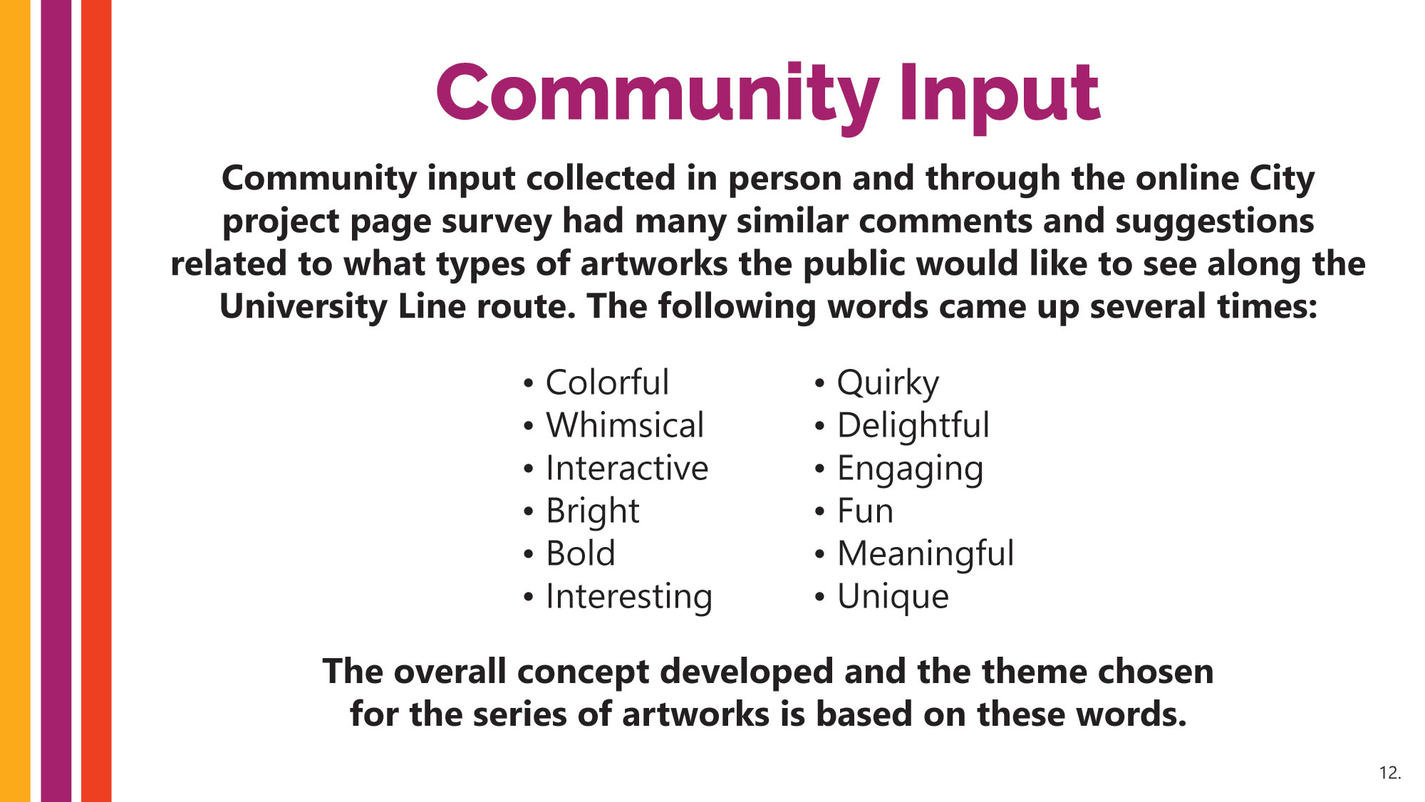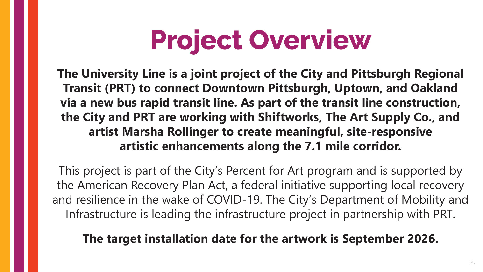 The project team is currently gathering input from anyone connected to these neighborhoods to inspire artwork along Pittsburgh Regional Transit’s University Line. Your feedback will help guide and direct the project team in determining how to move forward.